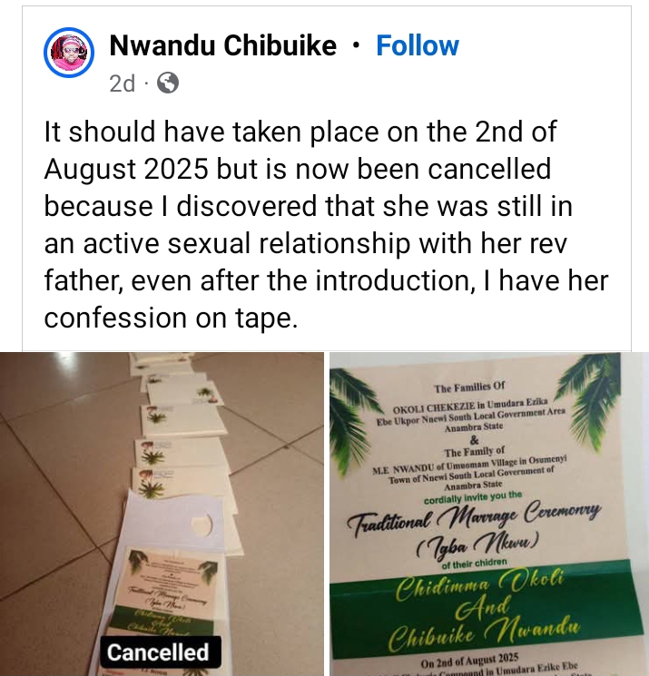 “It should have taken place on the 2nd of August 2025 but is now been cancelled because I discovered that she was still in an active sexual relationship with her rev father, even after the introduction, I have her confession on tape,” he wrote.