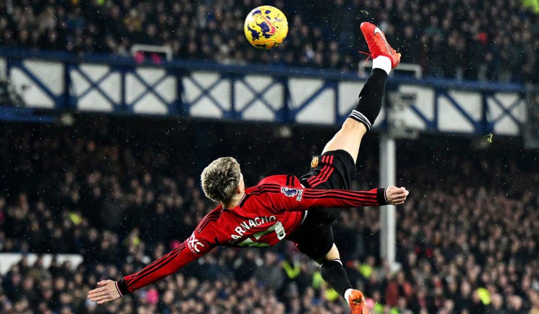 Garnacho produced a sensational acrobatic finish to open the scoring in the third minute of Manchester United’s 3-0 win at Everton, running away from goal to meet Diogo Dalot’s cross with a mid-air finish that flew into the top corner.
