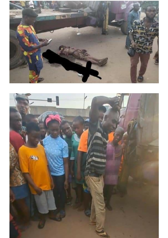 According to an eyewitness, the barrow pusher whose name was given as Mr Kingsley Orjiako, was running away from a revenue collector he saw along the road when a Keke Driver trying to reverse to the other side of the road hits him and he fell under a moving tipper.